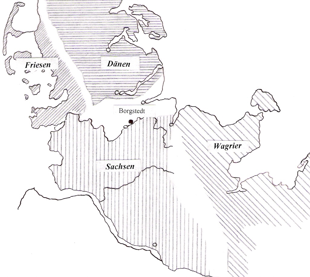 Das Reich Karls des Großen, ungleich größer als das des dänischen Königs Göttrik, erstreckte sich von den Pyrenäen bis zur Nordsee und vom Atlantik im Westen bis in das heutige Ungarn im Osten. Er ging zielstrebig daran, seine Staatsidee zu verwirklichen, das Christentum in den Norden zu bringen und sein Reich ebenfalls auszudehnen. Karl der Große beschloß, die Nordgrenze seines Imperiums auszudehnen und die dort ansässigen „Heiden“ (Holsten, Sachsen, Stormarn, Dithmarscher, Wagrier) zu christianisieren. Zu diesem Zweck schloß er mit den Wenden ein Bündnis, um den letzten Widerstand der Sachsen nördlich der Elbe zu brechen. Nach seinem endgültigen Sieg über die Sachsen überließ er den Wenden große Teile Holsteins. Einige Jahre später, um 810 n.Chr. wurden sie allerdings wieder auf ihre alten Gebiete in Ostholstein zurückgedrängt, und der Sachsenwall entstand als Grenzlinie zwischen Sachsen (Holsten, Stormaren) einerseits und den Wenden andererseits.