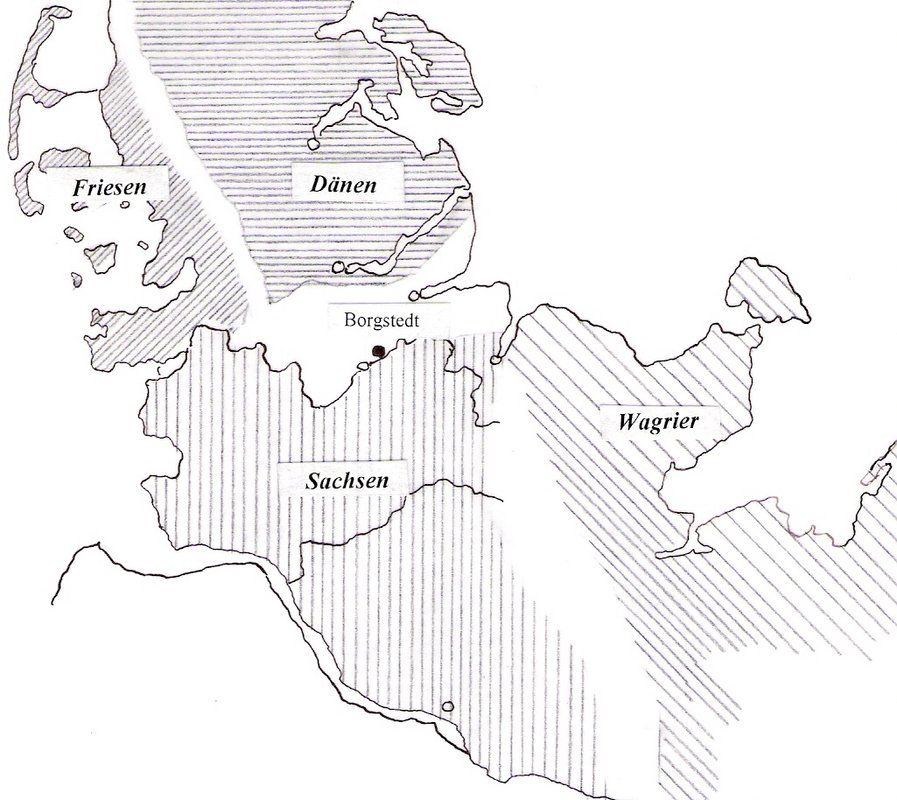 Göttrik fiel bald auf einem Kriegszug gegen die Friesen und sein Nachfolger Hemming sucht seinerseits bei Karl um Frieden nach. Beide trafen sich 811, wie damals üblich, an der Grenze ihrer Herrschaftsbereiche, an einem nicht namentlich bekannten Ort[13] an der Eider. Da dafür nur wenige Stellen am Fluß mit einer Furt in Frage kamen, darf man davon ausgehen, daß möglicherweise die Borgstedter die Ausrichter dieses Gipfeltreffens waren. Zwölf Franken und ebenso viele Dänen verhandelten über den Grenzverlauf. Das Verhandlungsergebnis wurde schriftlich und von den jeweils zwölf Zeugen jeder Partei beeidigt. Damit war die Eider die Grenze zwischen beiden Herrschaftsbereichen festgelegt aber unser Gebiet erfährt dennoch eine doppelte Zuordnung: politisch gehört es zu Dänemark mit der Eider als Grenze aber militärisch zum Frankenland mit dem Danewerk als Grenze. Es blieb dadurch so etwas wie ein Niemandsland, was auch niemanden sonderlich störte, denn es blieb lange Zeit siedlungsarm von seinen dichten, zusammenhängenden Wäldern geschützt. Allerdings führten durch das Gebiet schon zu karolingischer Zeit vielbefahrenen Durchgangsstraßen, von Jütland über Rendsburg nach Süden.