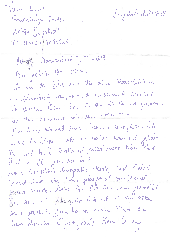 Auf diesen Bericht hin hat Frau Seifert, geb. Schepkauski, aus Borgstedt mit einem inhaltsreichem Brief geantwortet, Original siehe unten, Frau Seifert hat die Genehmigung erteilt, den Brief zu veröffentlichen.