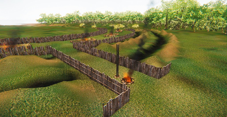 „Mit dem Besitz an Grund und Boden unterschiedlicher Qualität, mit den im Zuge der Sesshaftigkeit angehäuften Vorräten, mit unterschiedlichem Haustierbestand und mit ersten eingeführten Luxusgütern wachsen – das darf man schließen – vermutlich auch Begehrlichkeiten. Man wird genötigt, sich gegen andere Menschen zu wehren. Ein großes Erdwerk bei Büdelsdorf, Kr. Rendsburg-Eckernförde, mit mehreren, zum Teil konzentrischen Gräben ist in seiner Funktion noch nicht restlos geklärt. Es könnte sich aber durchaus um eine Art Befestigung handeln.“ [2]