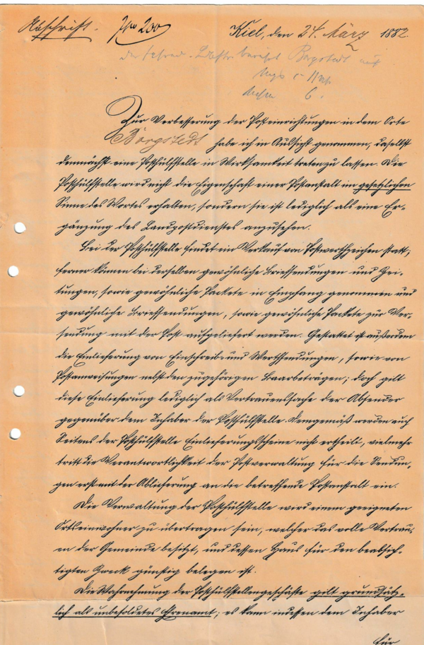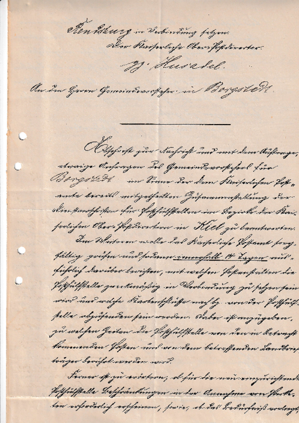 Abschrift zur Nachricht und mit dem Auftrage, etwaige Anfragen des Gemeindevorstehers für Borgstedt im Sinne der dem Kaiserlichen Postamte bereits mitgeteilte Zusammenstellung der Dienstvorschriften für Posthülfstellen im Bezirk der Kaiserlichen Oberpostdirektion in Kiel zu beantworten.
